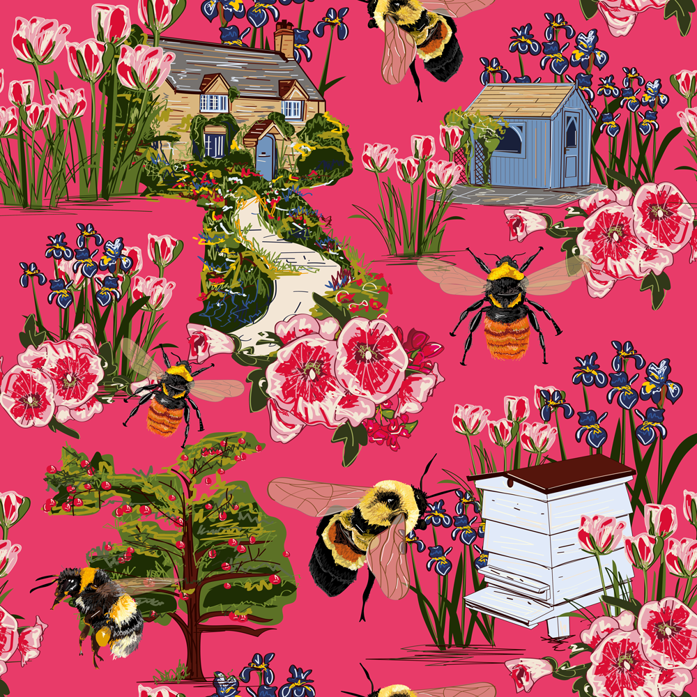 A joyful cottage-garden pattern buzzing with bees, flowers and countryside charm.