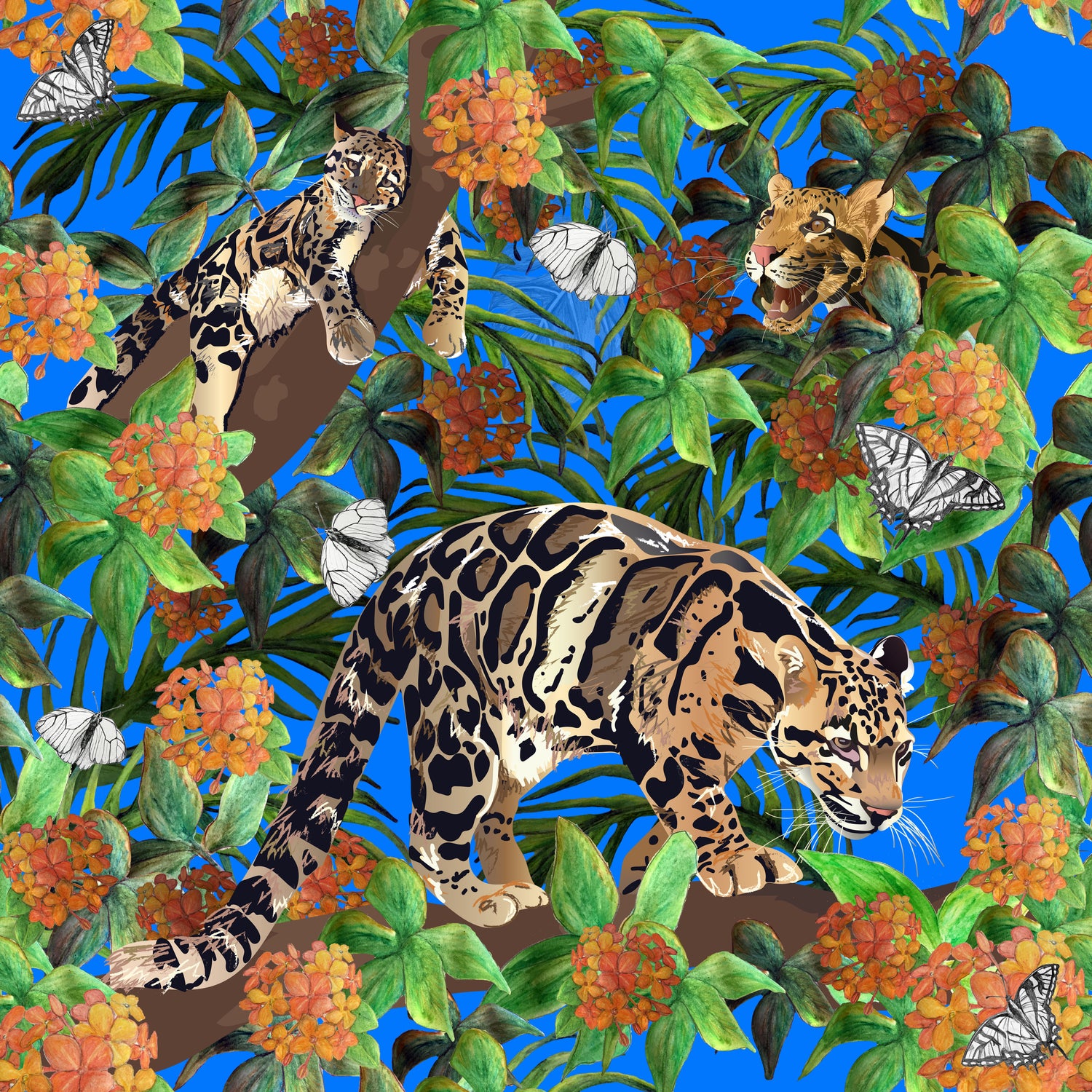 A vibrant wildlife pattern inspired by tropical forests, featuring clouded leopards, butterflies and lush foliage.